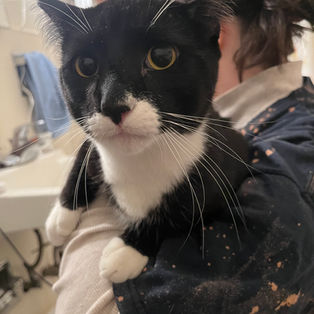Abbott is a reserved and sweet boy who loves playing with toys on a string (especially bird shaped toys and toys with feathers). He is still a bit apprehensive of pets but loves to eat Churu treats and play with toys, and is easily won over with a combination of the two. Though he is a little shy of new scenarios and can be wary of new people, once he is comfortable he loves to eat his treats and play with his toys. Abbott has not been around dogs or children, and would do best in a quiet home. He was raised with a lot of other cats, and is on his journey to becoming closer to his people (accomplished with copious amounts of treats), and would do best with a familiar cat, including his brother Prince.
